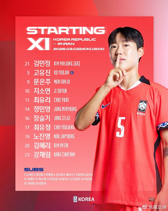 附:2026澳大利亚女足亚洲杯A组首战韩国阵容(4-1-4-1)