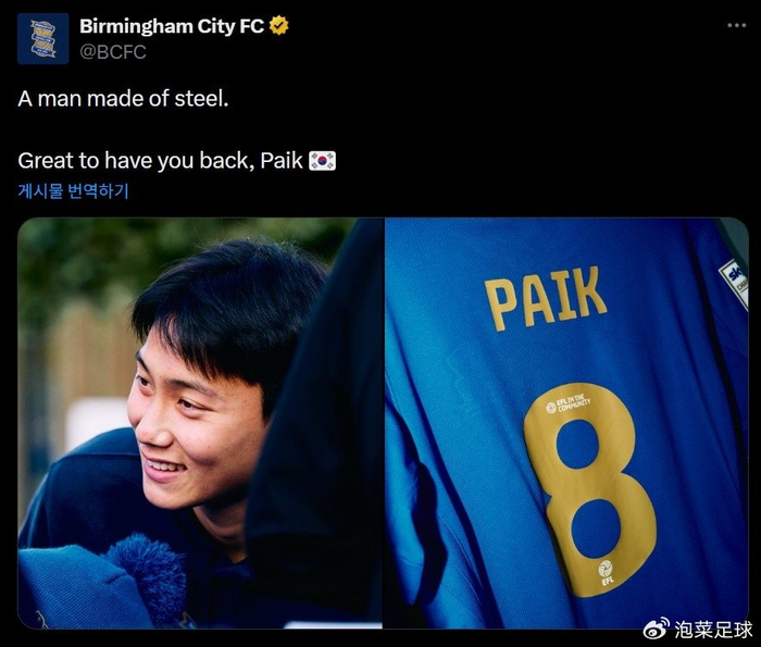 昨天我们报道了伤病号曹圭成复出的消息,而英国当地时间的3月2日晚,在2025-26赛季英冠联赛第35轮最后一场比赛中,因伤缺席比赛3场的白昇浩也回来了!赛前,伯明翰城官方宣布了这则消息,小白也确定进入比赛的大名单。在球队主场和米德尔斯堡进入到下半场第72分钟时,白昇浩替补登场,此时球队已经是1-3落后。
